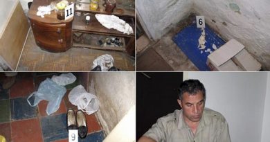 Combo photo of police handouts shows markers indicating evidence gathered from summer house of Macedonian journalist Taneski in Kicevo